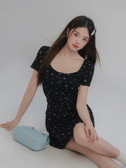 Black Floral Short Sleeve Mini/Maxi Dress